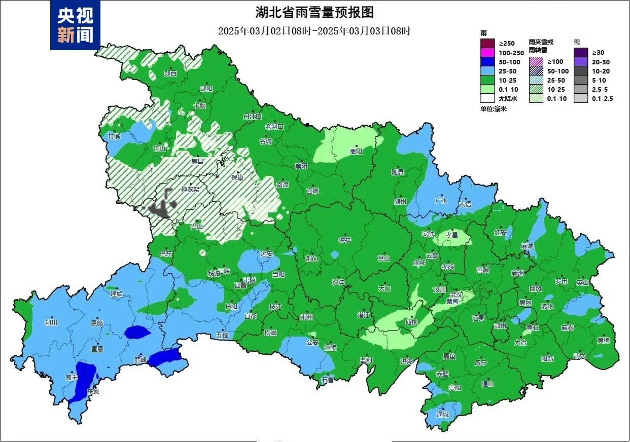预计3月2日至3日,湖北省自西向东将有寒潮大风和雨雪天气,大部分地区平均气温下降8℃~14℃,其中荆门东部、荆州东部、天门、潜江、仙桃、随州、孝感、武汉、黄冈、咸宁、鄂州、黄石等地下降15℃~18℃;偏北阵风7~9级、局地10级;2日晚至3日白天,北部地区有雨夹雪或雪,神农架、襄阳、随州等地有中到大雪、局地暴雪。
